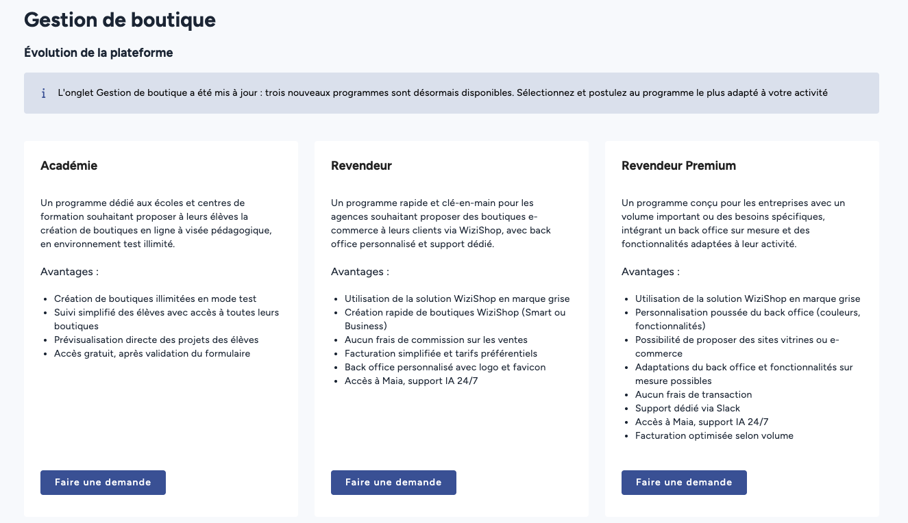 Le programme Gestion de boutiques de WiziShop Partners s'adresse aux professionnels et structures souhaitant créer, gérer et suivre des boutiques en ligne pour leurs clients ou leurs apprenants. Il se décline en deux volets distincts :