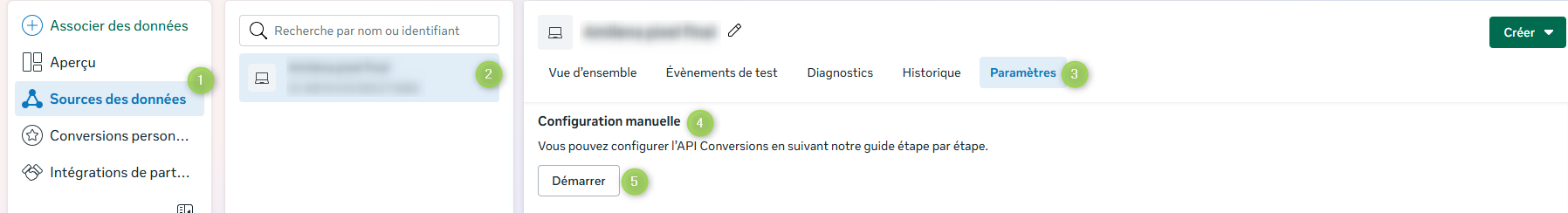 Cliquez sur l’icône Sources de données dans le menu à gauche. Sélectionnez le nom et l’ID des données que vous souhaitez associer à l’API Conversions, puis cliquez sur Paramètres, ensuite sur Configuration manuelle :