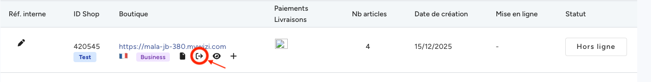 Cliquez sur l'icône de la flèche à droite de la boutique — vous êtes alors redirigé vers le back office WiziShop de cette boutique.