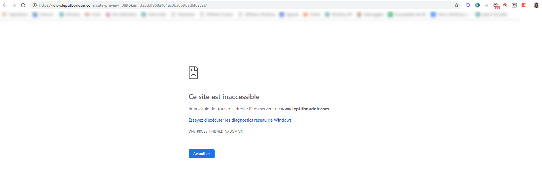 Lorsque vous commandez ou configurez un nom de domaine sur votre site, cela peut prendre entre 24 et 48 heures avant qu'il ne s'active. Rassurez-vous, c'est normal. Durant cette période d'activation, en cliquant sur "Voir mon site" en haut à droite de votre espace d'administration, vous verrez une page de ce type :